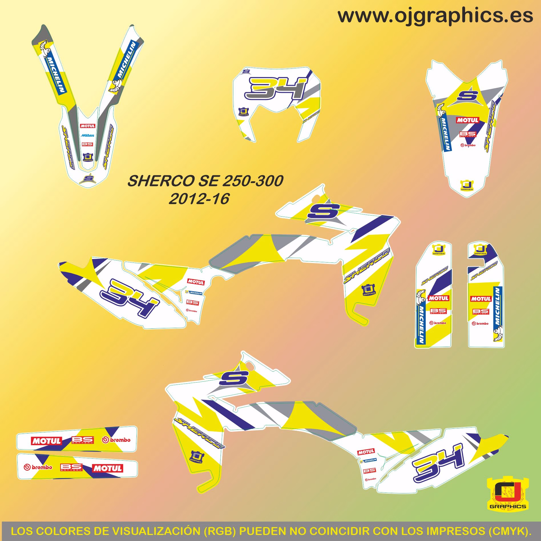 Kit de adhesivos para SHERCO SER-SEF del 2012-16 compuesto por Aletas radiador, Guardabarros delantero y trasero, paramanos, protectores de horquilla, tapas laterales, basculante y careta del faro. Fabricado en vinilo polimérico de gran calidad con adhesivo de alto agarre y laminado grueso transparente y flexible que se adapta muy bien a las curvas de tu moto. 540 Mícras.